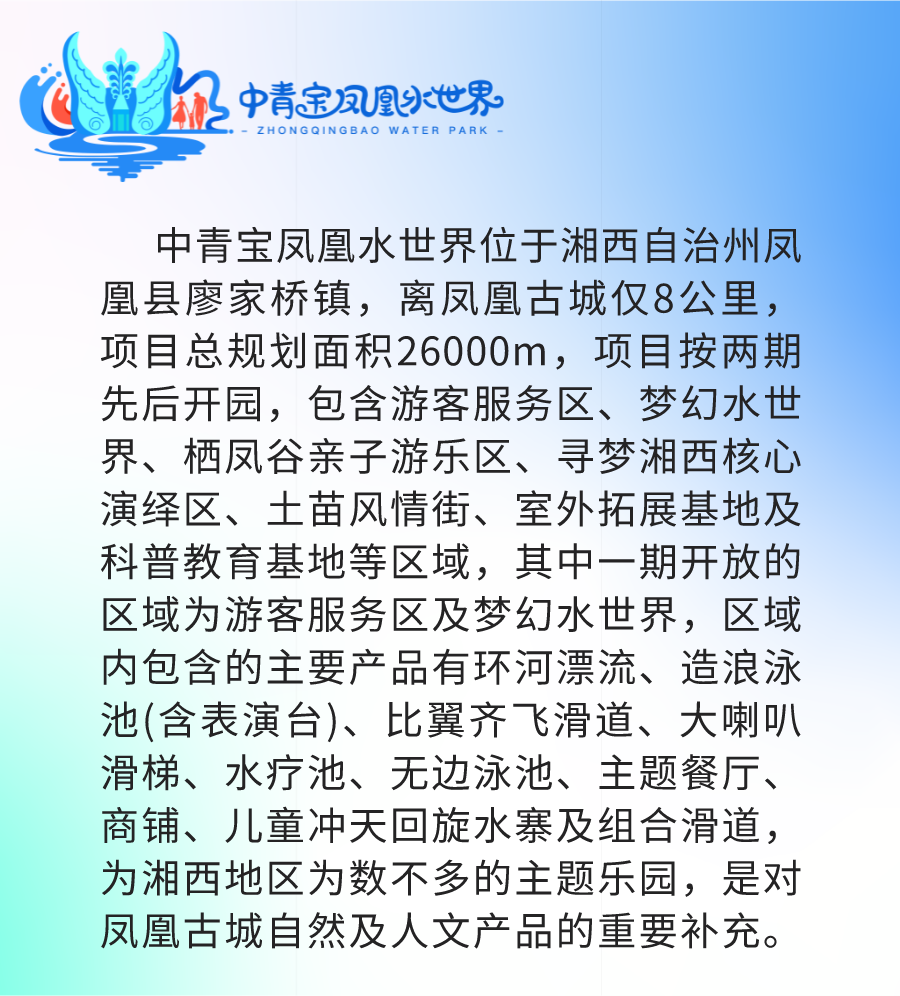由深圳中青寶互動(dòng)網(wǎng)絡(luò)股份有限公司(以下簡(jiǎn)稱:中青寶)以“湘西印象”為魂,以湘西文化故事為背景,將現(xiàn)代娛樂(lè)理念與湘西民俗文化相結(jié)合,以沉浸式民俗演繹、主題化場(chǎng)景、水上游樂(lè)項(xiàng)目為媒介,傳承發(fā)展湘西民俗文化,致力于打造極具現(xiàn)代思潮的湘西文化水公園,試運(yùn)營(yíng)籌備工作已啟動(dòng)!目前已在高速下道口、鳳凰古城高鐵站轉(zhuǎn)換大廳、古城專線大巴候車點(diǎn)、城北游客集散中心等地完成大型戶外廣告牌及燈箱廣告的刊登,并逐步推進(jìn)縣域公交站臺(tái)、戶外LED及廣告牌的宣傳。
